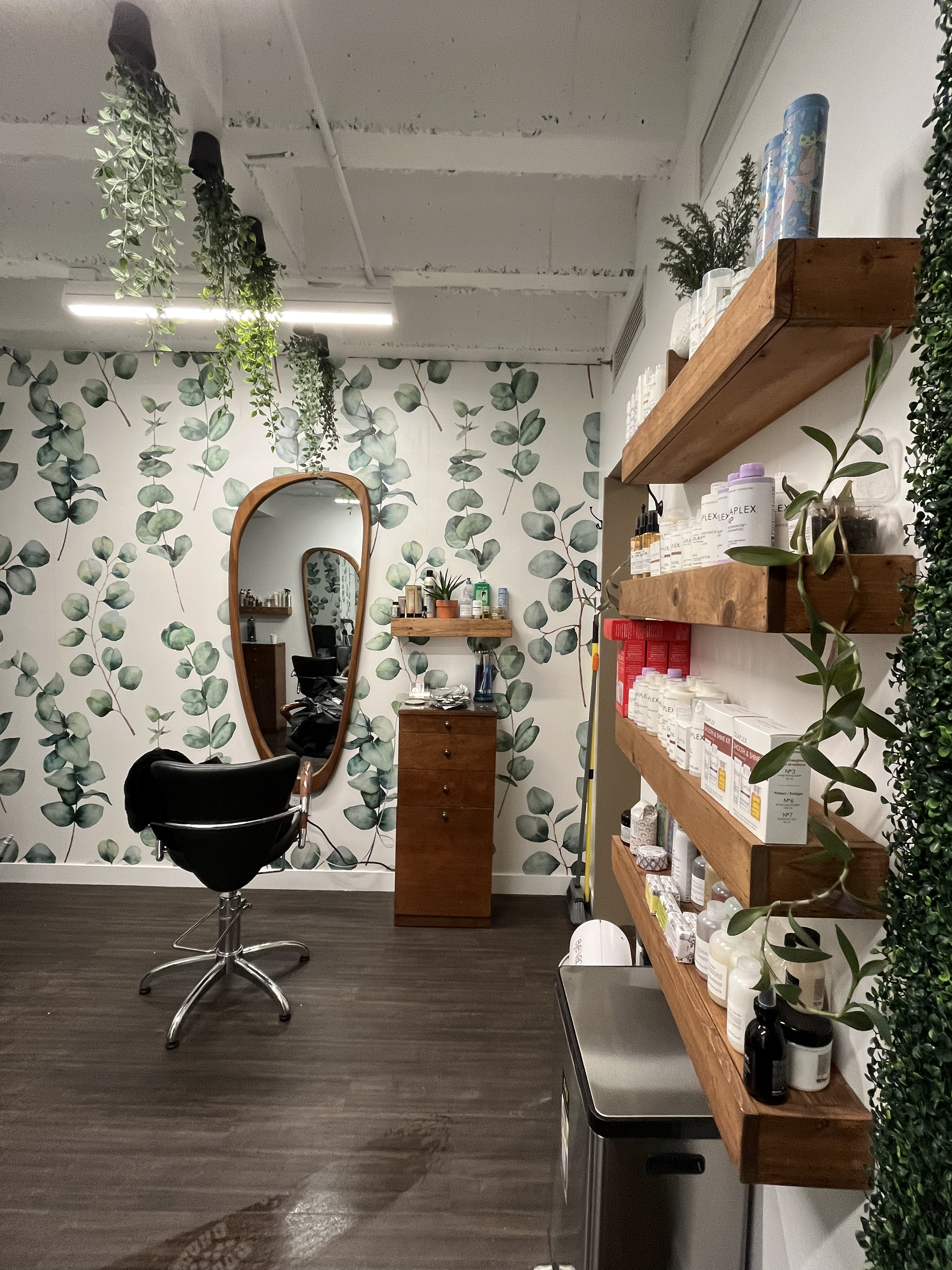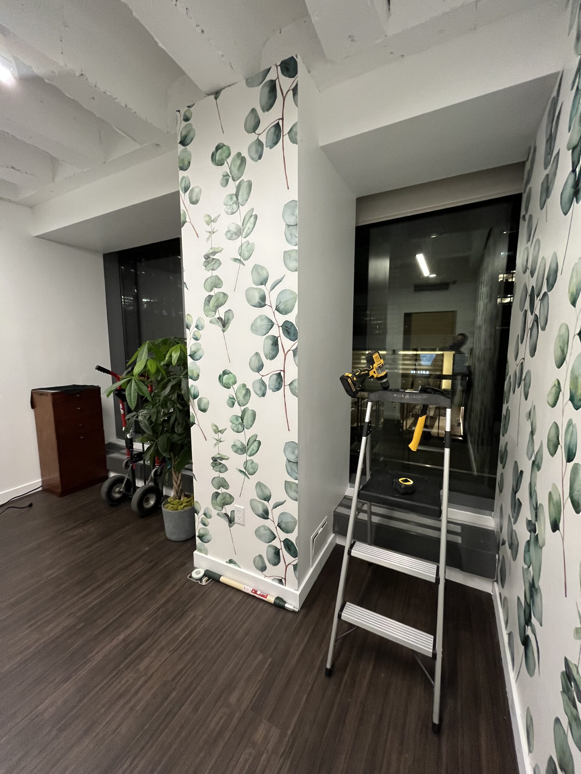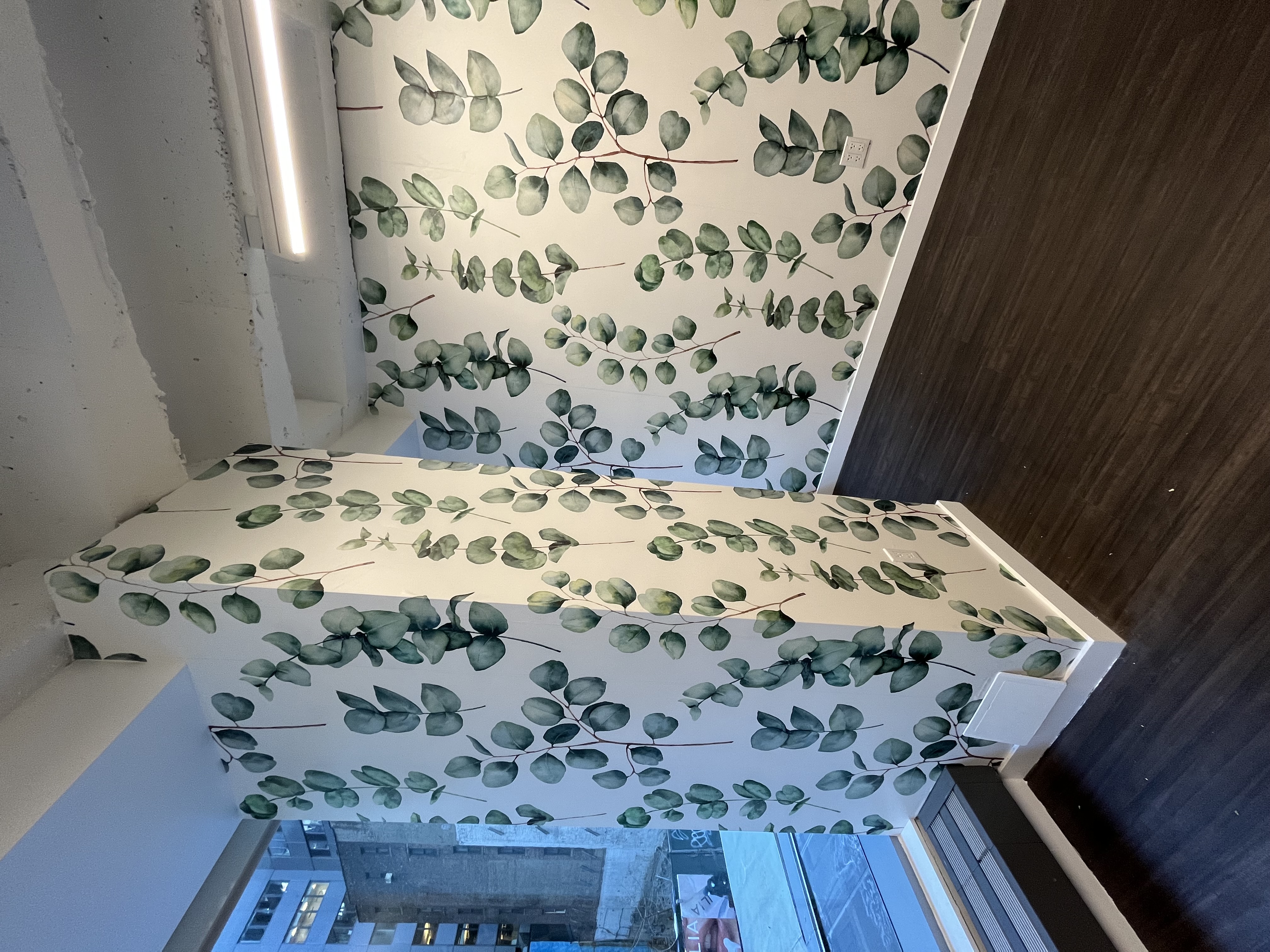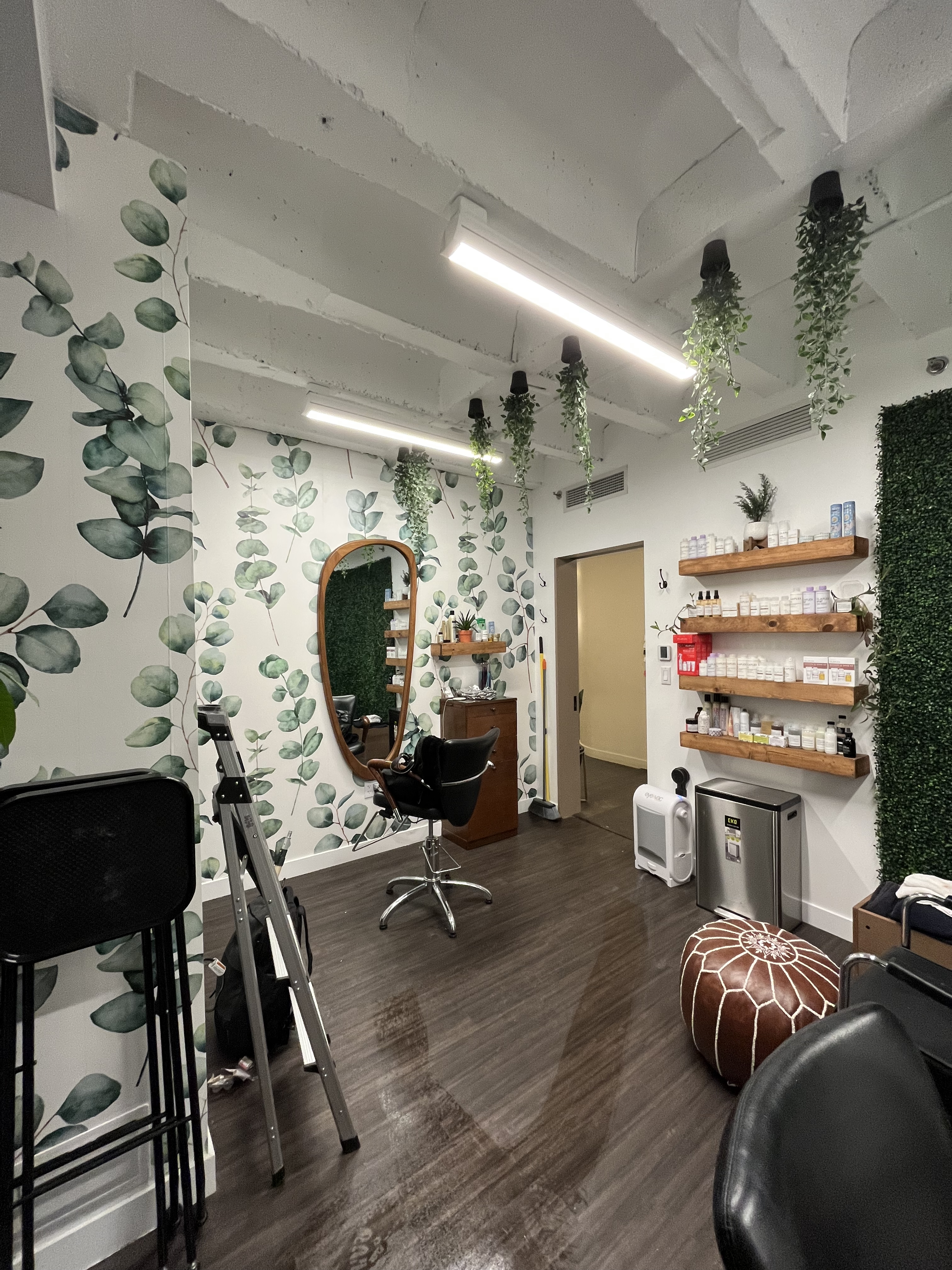 This leafy lathered oasis was a project commissioned by a hair stylist/ salon owner in midtown Manhattan on 59th Street near the Bloomingdale's shopping center. She wanted the space to have a sophisticated forestry vibe. I wrapped the walls in a leaf patterned easy to clean wallpaper, mounted some shelving for the hair products, hung the viewing body mirrors, and drilled some faux plants with up-side-down pottery from the ceiling.