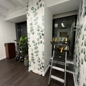 The scope of work encompassed, wallpapering, shelving mounts for all the products, uniquely designed naturally shaped vanity body-length mirror selection and mount, faux foliage green wall, and up-side-down handing faux planters and an IKEA wall mounted cabinet for additional storage.
